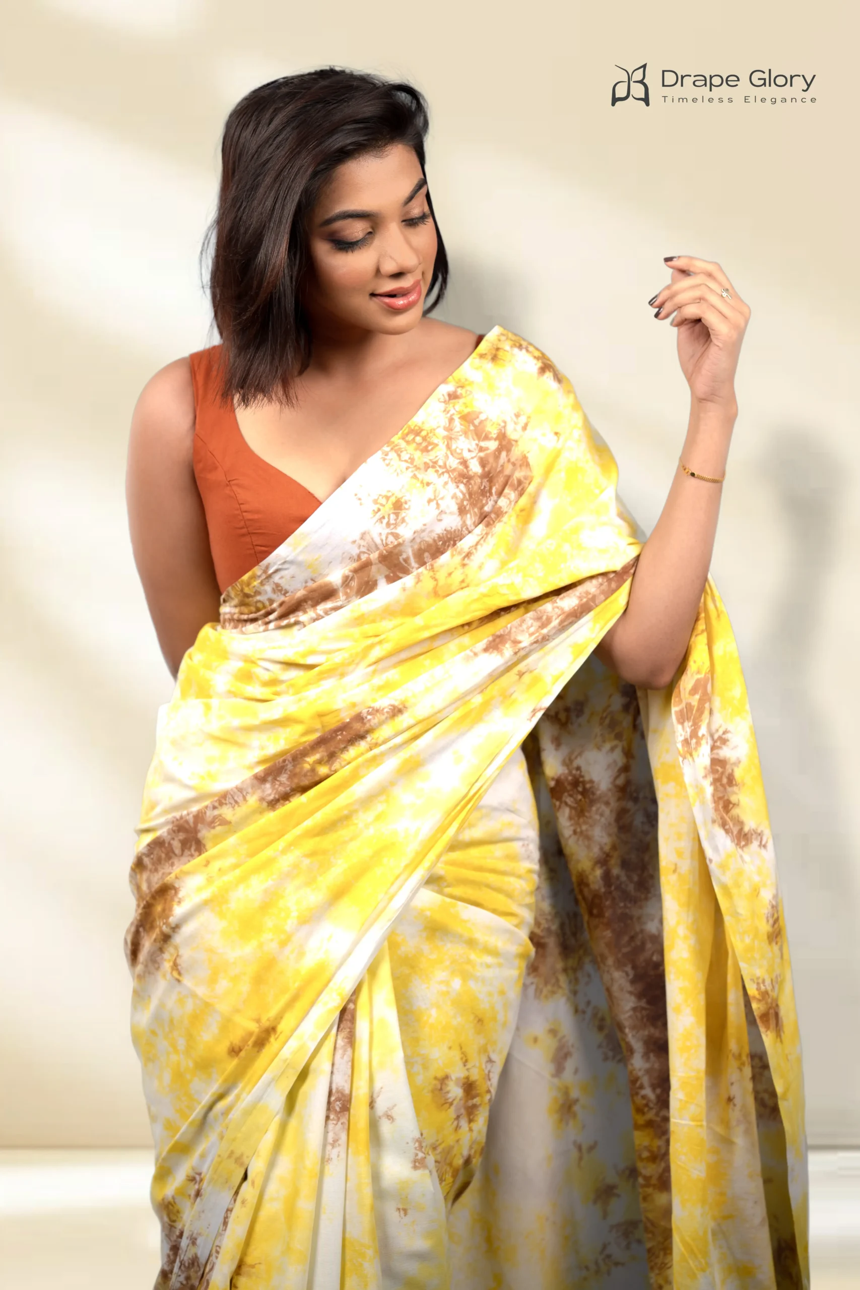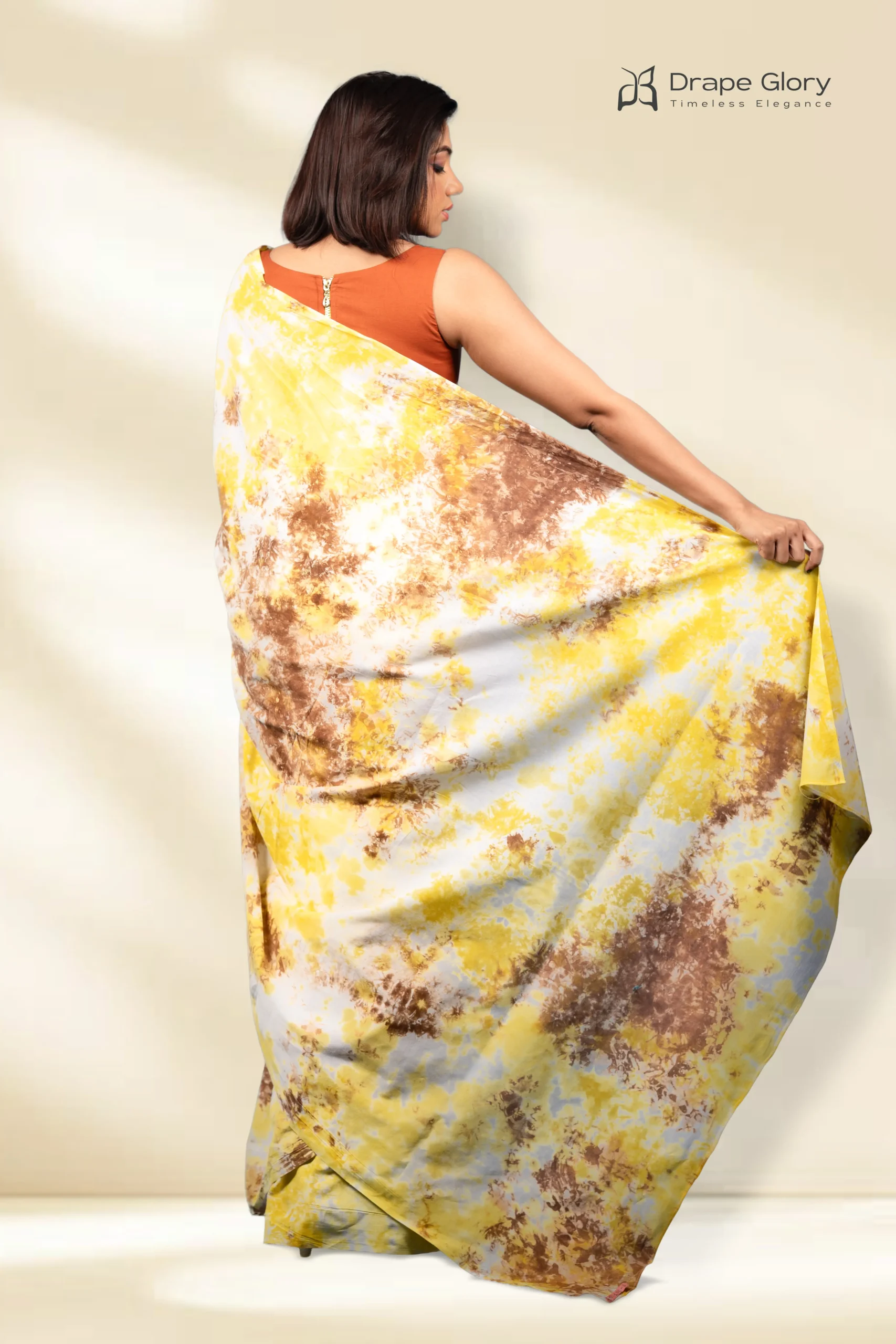 Handcrafted yellow and brown tie dye saree on soft cotton voil, featuring 6 yards of easy, earthy elegance and a matching 1-yard blouse piece. Lightweight, gift-box packed, and part of DrapeGlory’s surprise-filled gifting experience, with worldwide delivery.